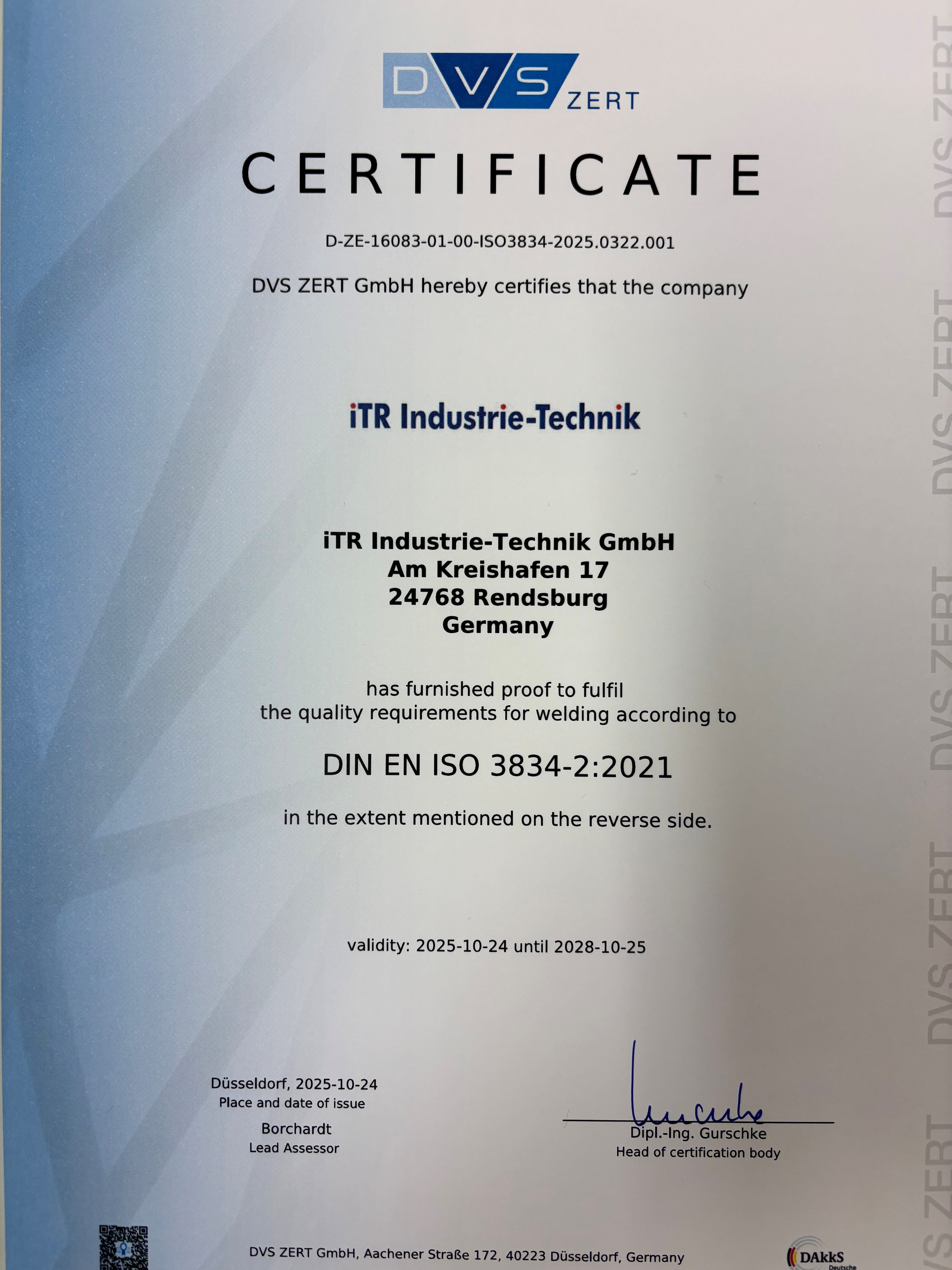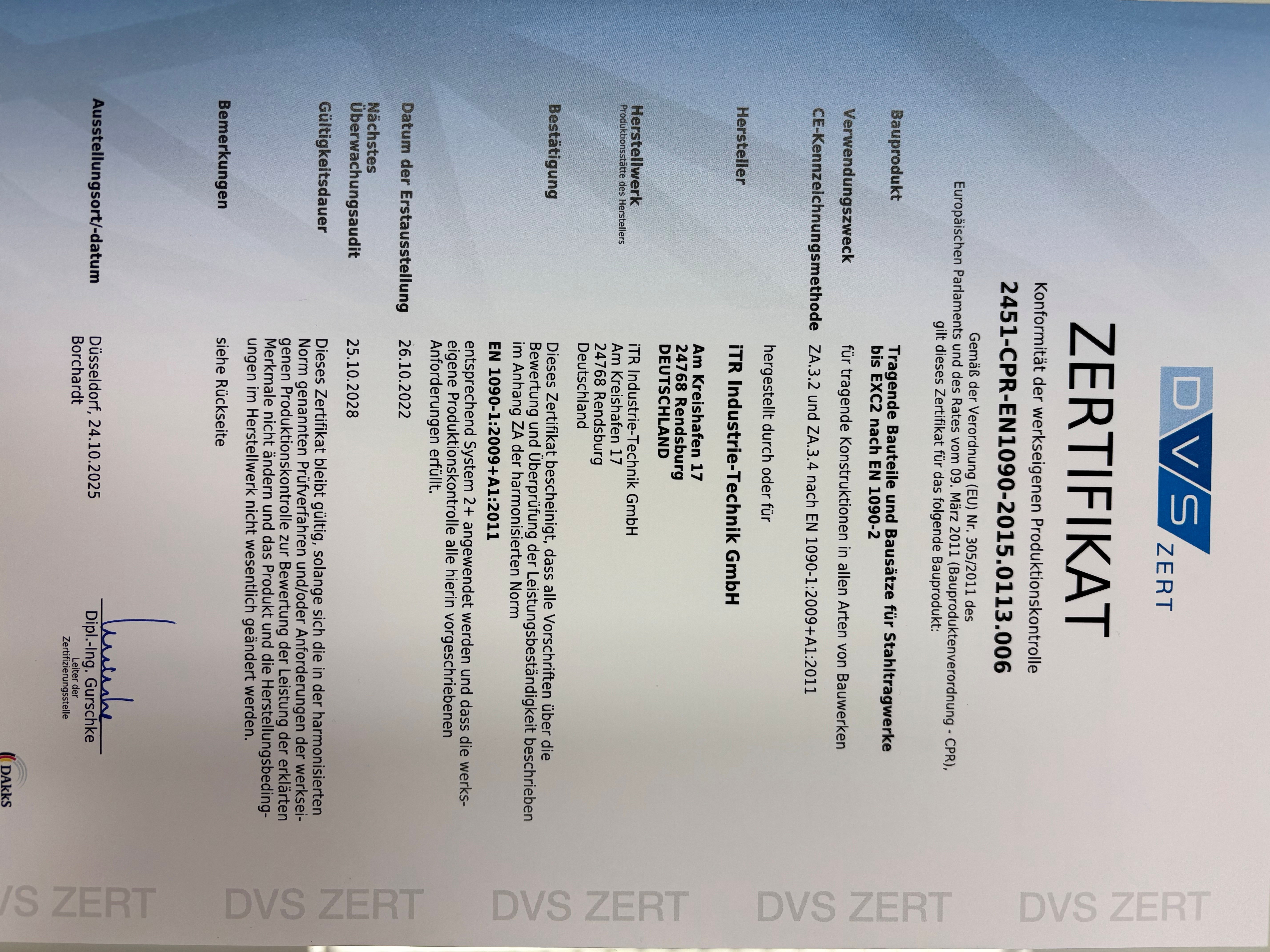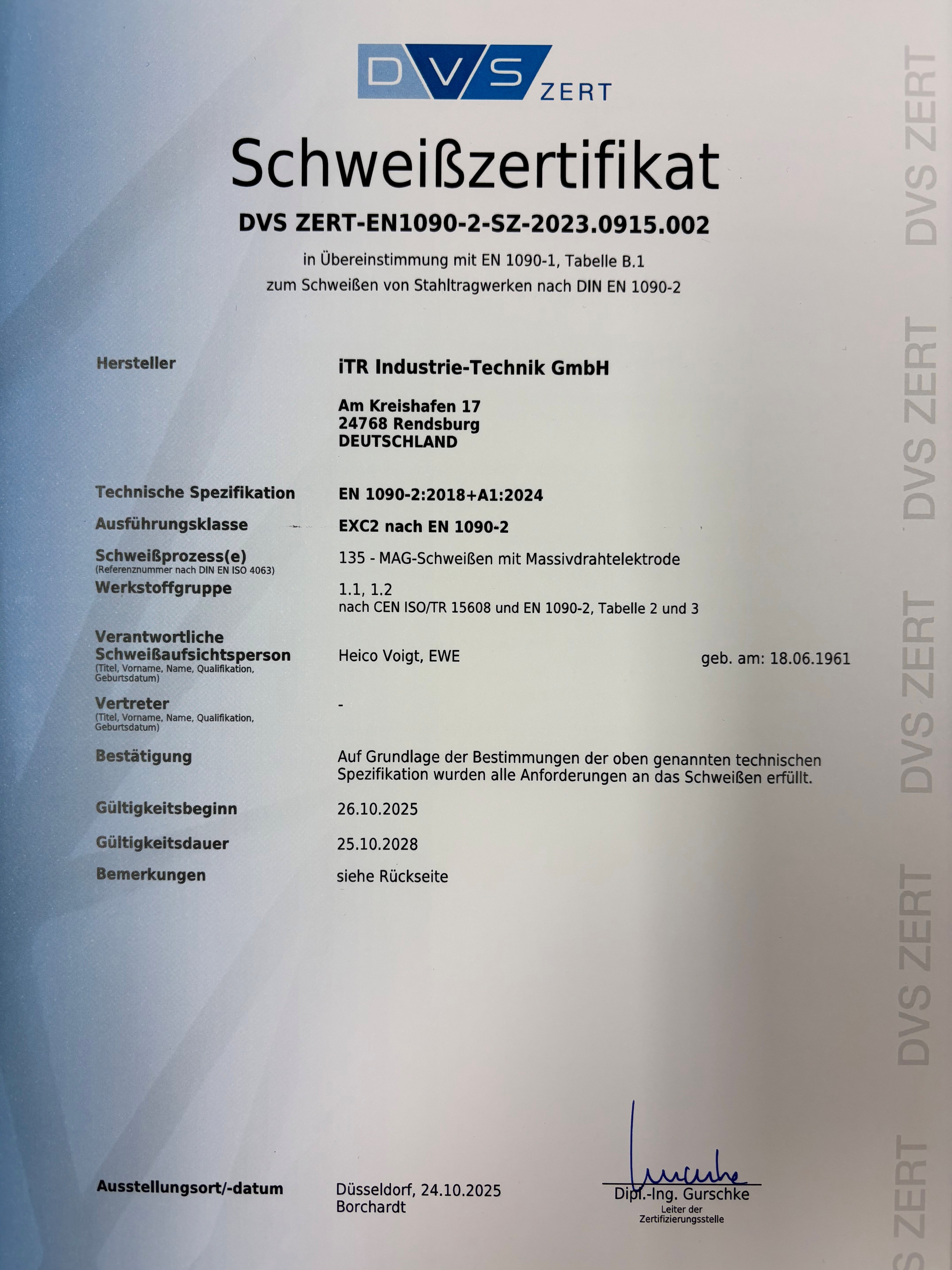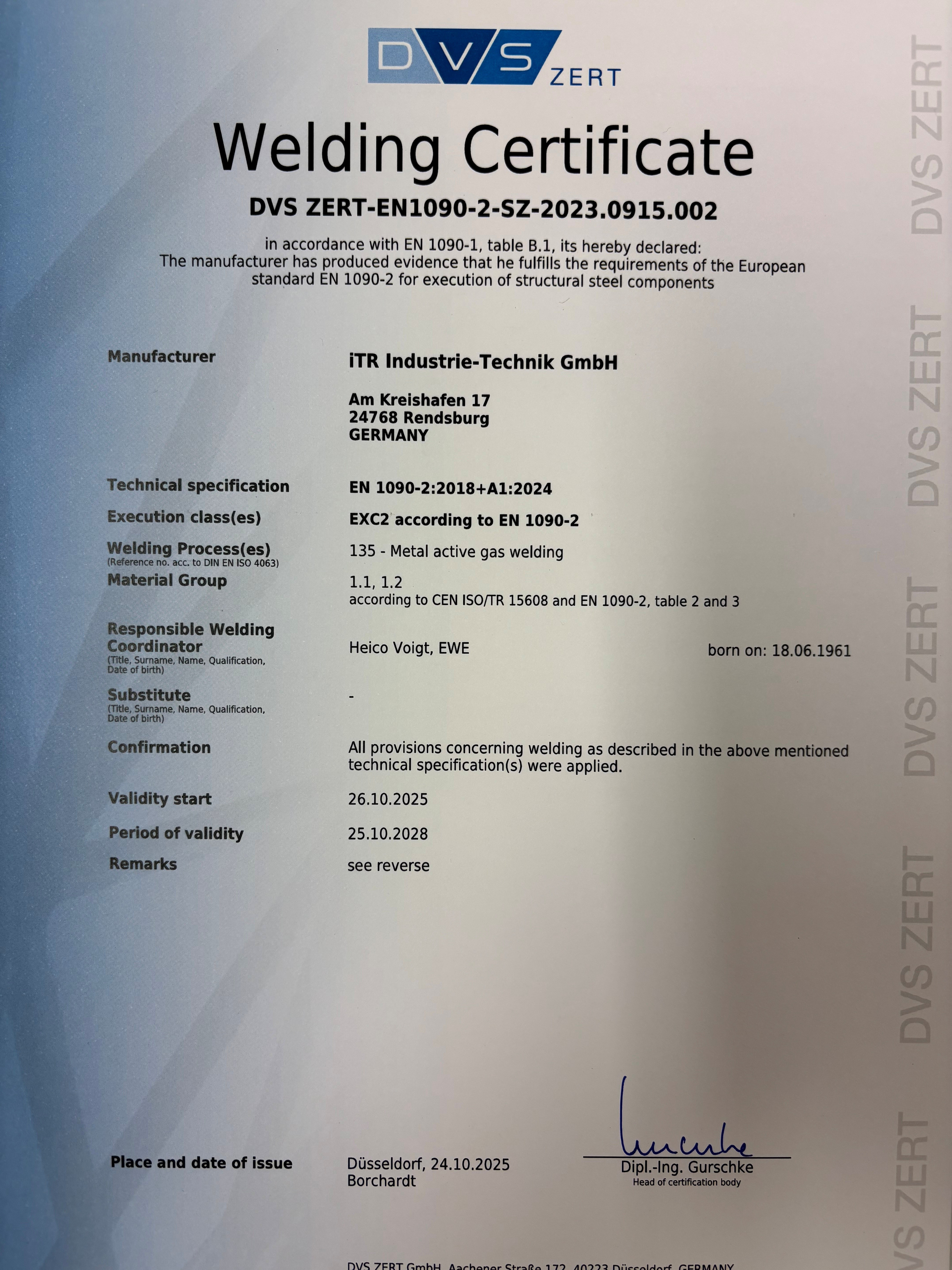Wir sind seit dem 23.10.2025 Inhaber der Herstellerqualifikation nach DIN 2303 und können relevante Arbeiten der Bauklasse BK 1 in den Prozessen Metall-Aktivgasschweißen mit Massivdrahtelektrode an den Werkstoffgruppen ausführen DIN CEN ISO/TR 15608: 1.1 ,1.2